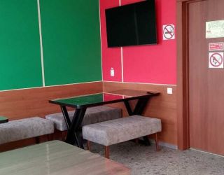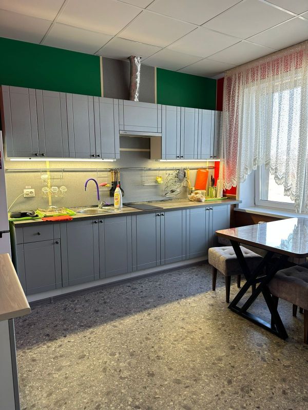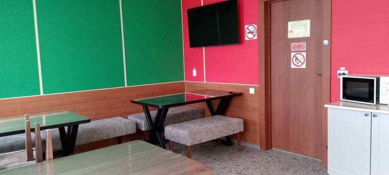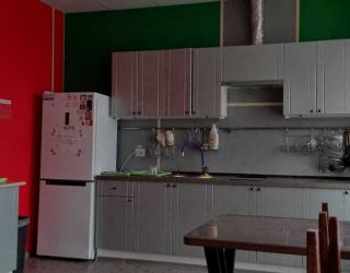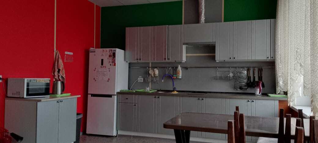 В хостеле обустроена общая кухня, где найдется все необходимое для готовки и хранения продуктов: плита, микроволновая печь, холодильники, шкафчики, посуда. Выделено обеденное пространство со столами, стульями и диваном.